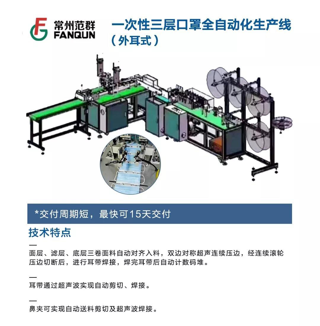 考慮到目前巨大的口罩需求矛盾,常州范群利用其自身的設備制造企業優勢,在這個特殊時期,向客戶特別推出全自動一次性三層口罩生產線(外耳式一拖一)和全自動一次性三層口罩生產線(外耳式一拖二)兩款設備。以下為設備具體參數信息。